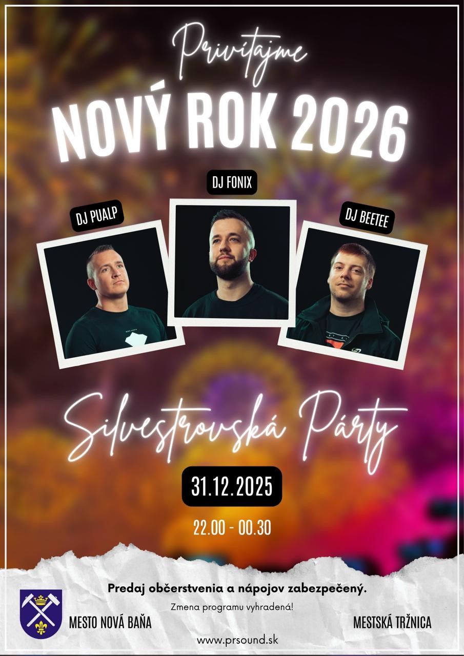 Mesto Nová Baňa Vás srdečne pozýva na Silvestrovskú párty!Príďte s nami osláviť posledný večer roka a spoločne, hlavne s úsmevom na tvári, privítať nový rok 2026.